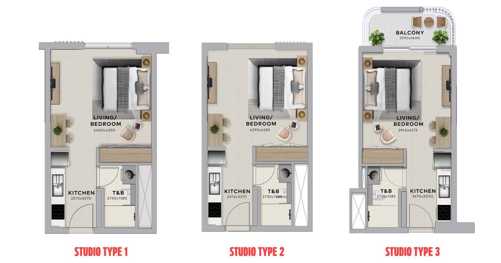 Studio, 1 to 3 Bedrooms